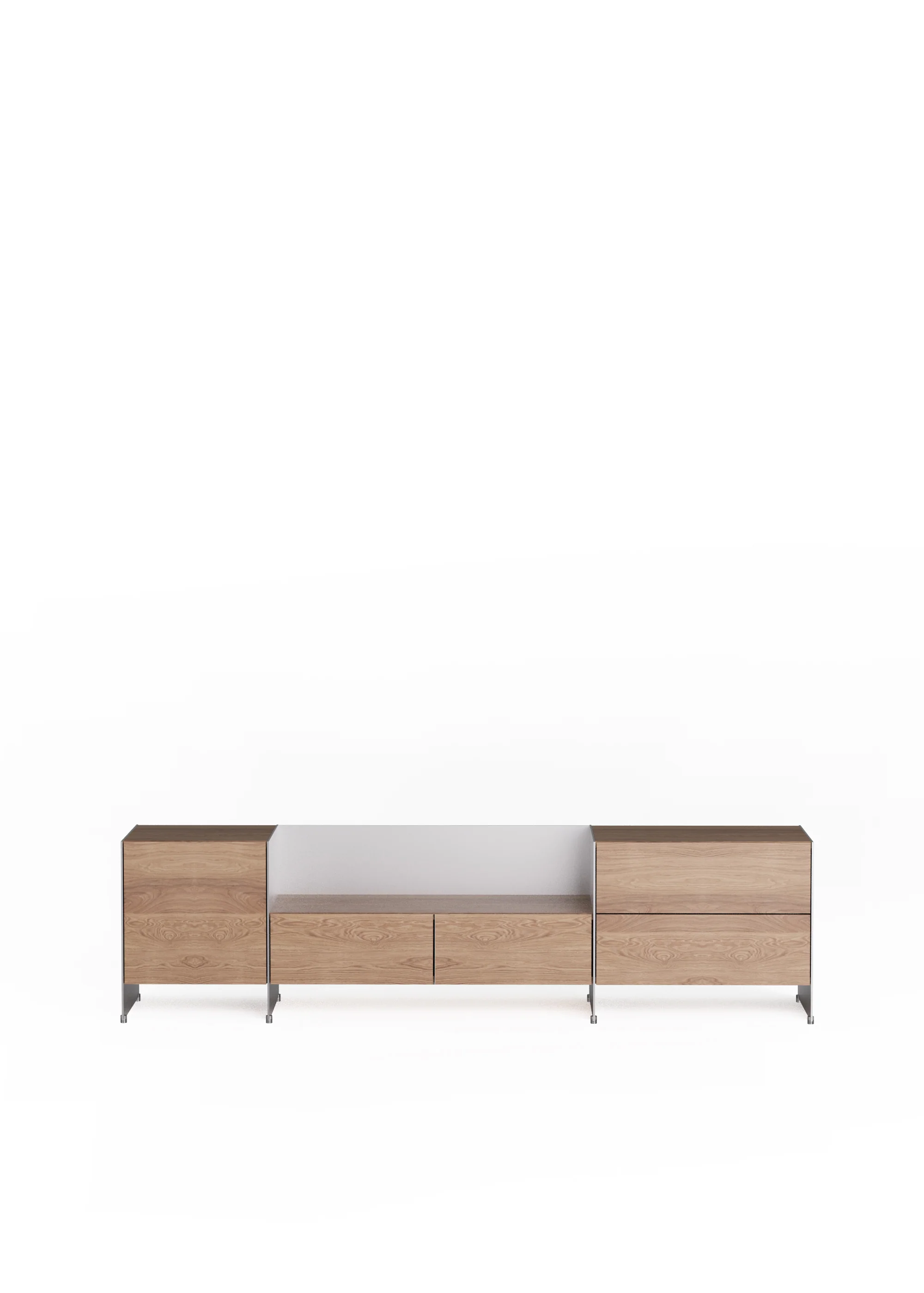 A freestanding configuration of three modules within the ALOOX collection, made of natural solid wood and precision-engineered aluminium. Based on a cohesive modular logic, it offers a compact composition that can be reconfigured or expanded over time. As a freestanding structure, it adapts effortlessly to its environment, redefining furniture as a durable, versatile, and timeless form.