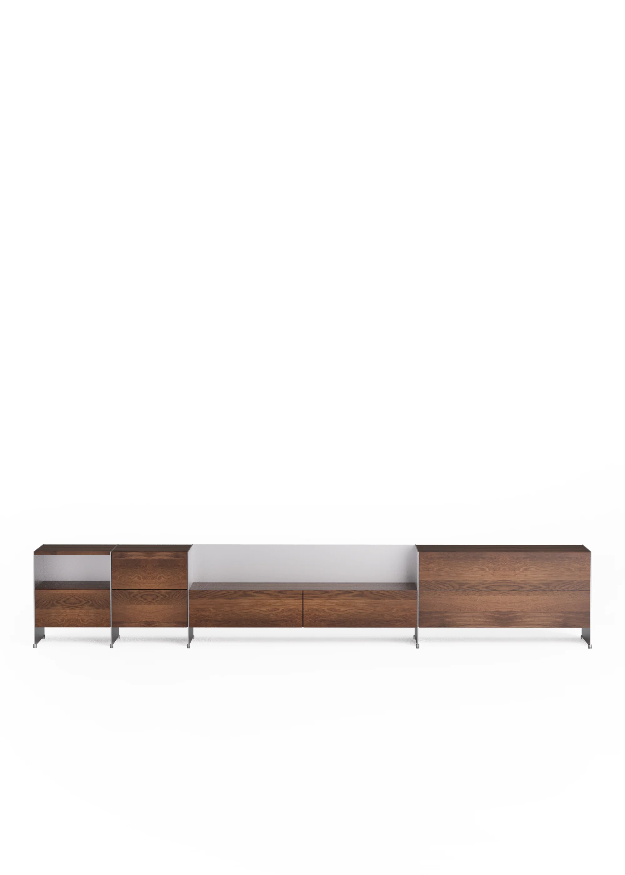 A freestanding configuration of four modules within the ALOOX collection, made of natural solid wood and precision-engineered aluminium. Expanding the modular system, it provides greater capacity while maintaining flexibility and architectural clarity. As a freestanding structure, it adapts effortlessly to its environment, redefining furniture as a durable, versatile, and timeless form.